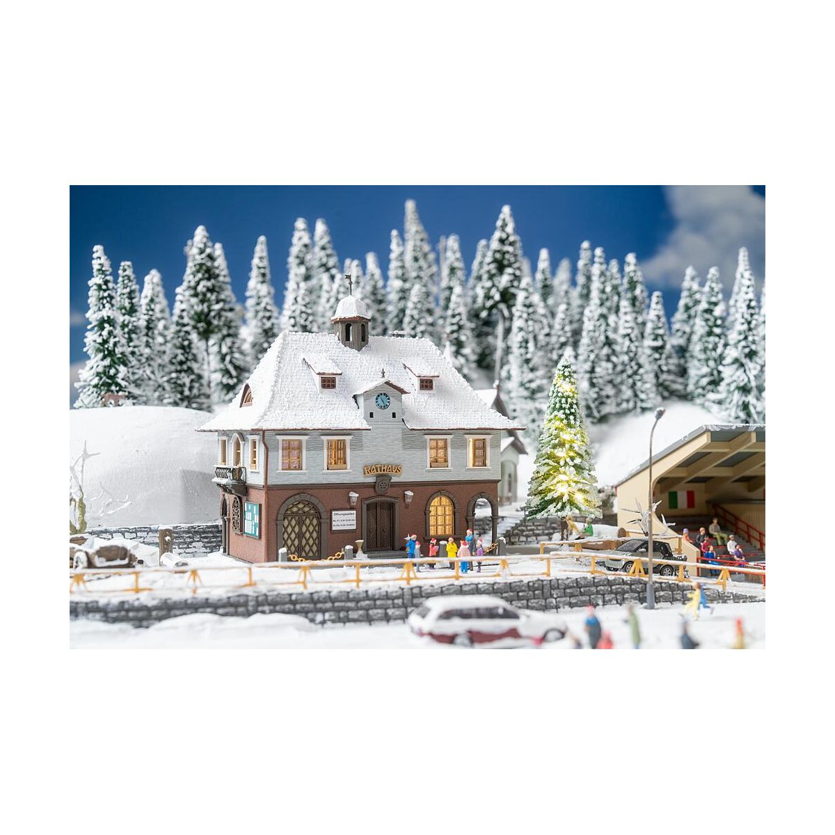 O Tannenbaum, o Tannenbaum – festlich erklingt der Gesang durch die Miniaturwelt. Vor dem funkelnd erleuchteten Weihnachtsbaum versammelt sich der kleine Chor, um gemeinsam vor dem Rathaus stimmungsvolle Weihnachtslieder zu singen. Das Rathaus selbst präsentiert sich in rustikalem Charme: eine Kombination aus Blau und Braun, mit dunklen Ziegeln gedeckt und einem verträumten Türmchen auf dem Dach._x000D_ _x000D_ Inhalt: Rathaus, Weihnachtsbaum (und Beleuchtung), 7 Figuren_x000D_