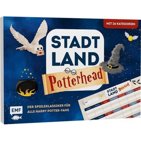 Der Spieleklassiker für alle Harry Potter-Fans von 8-99 Jahren Egal wo du bist ? Mit dieser spannenden Stadt,Land,Potterhead-Edition bringst du immer eine große Portion Spaß mit in die Runde! In 26 Kategorien könnt ihr euer Hogwarts-Wissen testen und eure Kreativität unter Beweis stellen. Mit dem coolen Design und den spannenden Themen überzeugt der Spieleblock jeden Potter-Fan, egal ob groß oder klein. Von einfachen Fragen bis hin zu kniffligen Kategorien ? hier ist alles und für jeden etwas dabei. Der Spieleklassiker mit 26 coolen und spannenden Kategorien Die ultimative Potterheads-Edition für alle Harry Potter-Fans Mit 50 Blatt und praktischer Anti-Schummel-ABC-Drehscheibe Für alt und jung ? von 8-99 Jahren.Tauche ein in die Welt der Zauberer und teste dich und deine Freunde ? Wer von euch ist der größte Potter-Fan und kann die Kategorien am schnellsten ausfüllen? Faktenwissen, Kreativität und Schnelligkeit sind gefragt, nur so schaffst du es, als erstes Stopp! zu rufen. Bist du bereit, in die Welt von Harry Potter und seinen Freunden einzutauchen? Dann ran an die Stifte, fertig, los!.