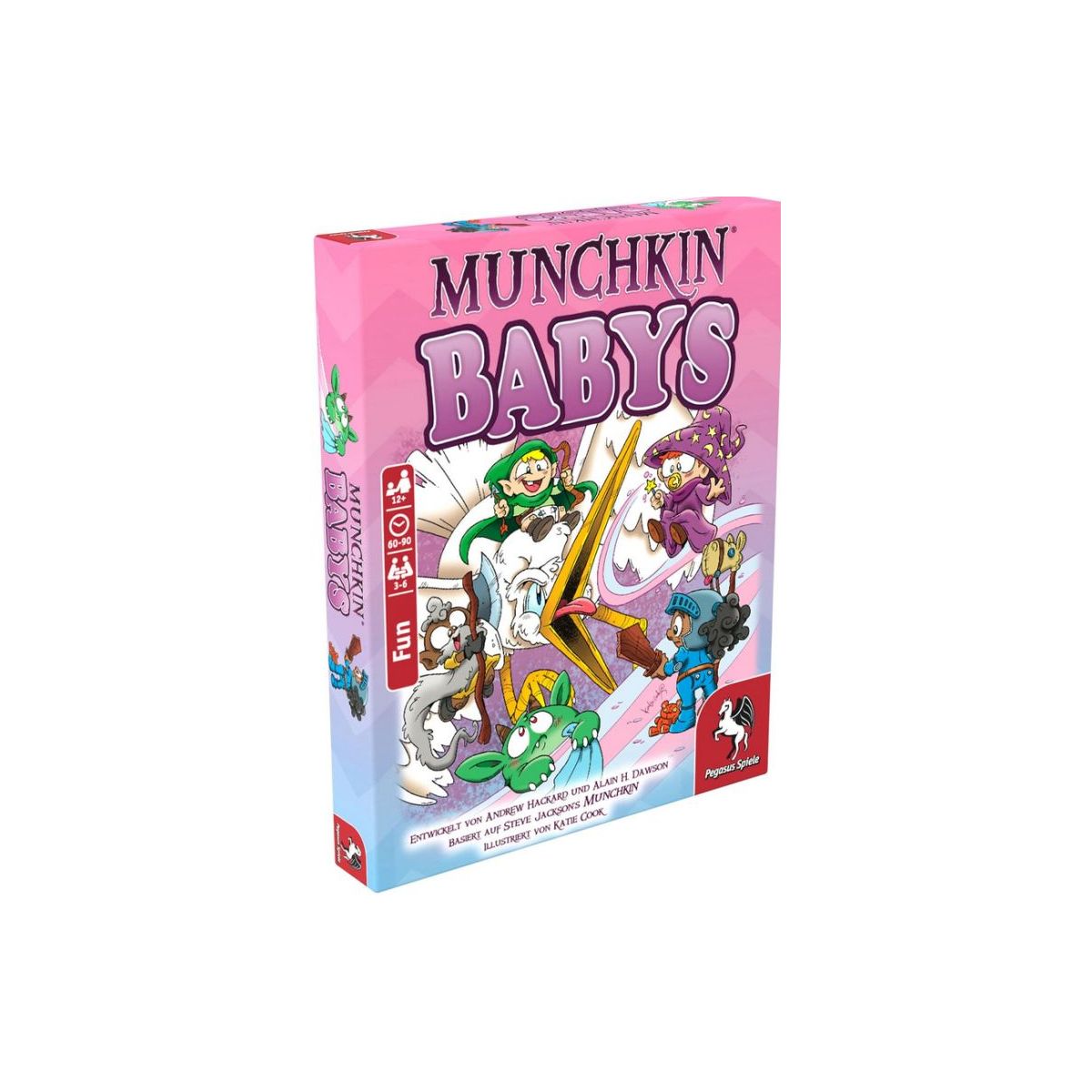 Achtung, Babyalarm! Die Spielenden schlüpfen in die Rollen von Orkileins, Giftzwergen, Elflingen oder Viertellingen (was? So heißen halbe Halblinge nunmal!). Im fantastischen und vollinklusiven Kindergarten erlernen sie ihre Klasse und werden z.B. Zauberschüler, Wadenbeißerin, Krümeldieb oder Scheinheilige. Gerüstet mit den fürchterlichsten Gegenständen aus der Spielzeugkiste – wie der Kampfrassel, dem Unendlich nervtötenden Spielzeug oder der Decke der Massenvernichtung – bekämpfen sie Monster wie die Wangenkneifende Tante, den Spielplatztroll und den schrecklichen Kinderarzt. All das und noch viel mehr erwartet die Spielenden in Munchkin Babys! Wer krabbelt als Erstes auf Stufe 10? Das eigenständig spielbare Basisset Munchkin Babys besticht mit 168 Karten voller süßer, bezaubernder Abenteurer-Babys, die ihren erwachsenen Versionen aus Munchkin in nichts nachstehen, wenn es darum geht, sich gegenseitig in den Rücken zu fallen und die Beute einzusacken. Munchkin, die Munchkin-Charaktere, und das Pyramiden-Logo sind eingetragene Marken oder Handelsmarken von Steve Jackson Games Incorporated in den USA und anderswo und werden von Pegasus Spiele in Lizenz benutzt. Alle Rechte vorbehalten..