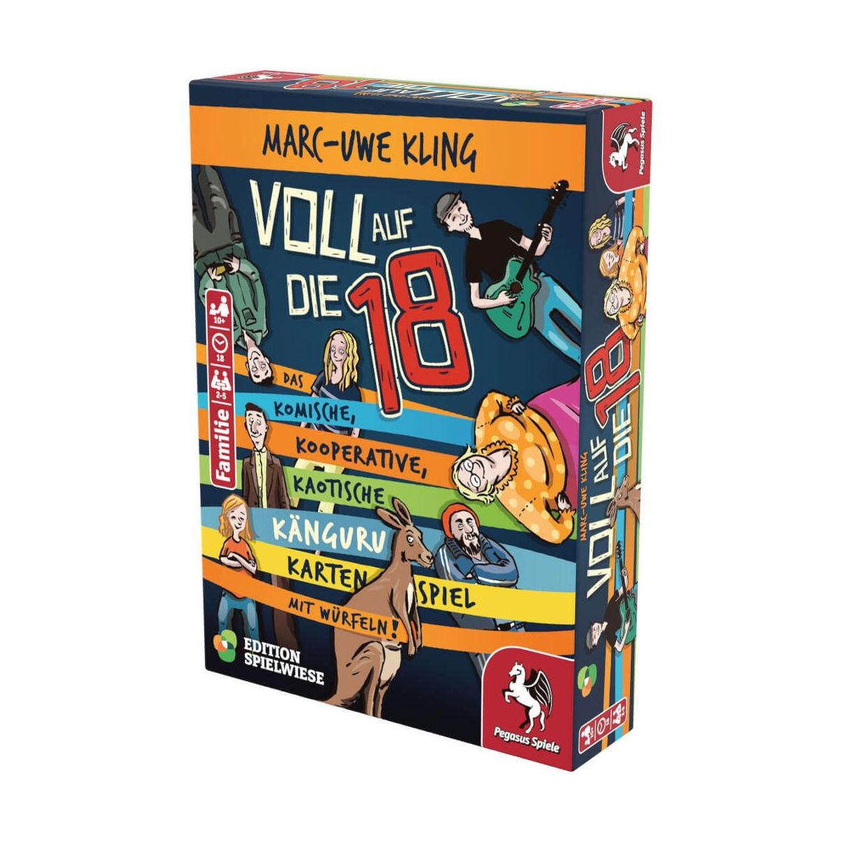 Marc-Uwe Kling ist bekannt als Liedermacher, Kabarettist und Autor. Seinen großen Durchbruch hatte er mit Geschichten rund um ein kommunistisches Känguru, das mit dem Kleinkünstler Marc-Uwe zusammenlebt und dessen Leben gewaltig auf den Kopf stellt. Passend zum zweiten Känguru Chroniken-Film erscheint mit Voll auf die 18 ein komisches, kooperatives und kaotisches Känguru-Kartenspiel mit Würfeln, das zudem auch noch 100 gute Argumente gegen Nazis bietet. Zwei bis fünf Spielende ab zehn Jahren schlüpfen in die Rollen von Känguru, Kleinkünstler*innen oder anderen Mitgliedern des äAsozialen Netzwerks“. Gemeinsam möchten sie Nazis überzeugen, um die Welt ein Stück besser zu machen. Jeder Nazi hat einen individuellen IQ. Die Spielenden müssen Karten mit Argumenten (und Zahlen von 1 bis 6) ausspielen, deren Summe genau dem IQ des jeweiligen Nazis entspricht. Es kann sowohl alleine als auch gemeinsam äargumentiert“ werden. Manche Nazis haben ein Faible für bestimmte Dinge (zum Beispiel Kartenfarben) und bringen weitere Vorgaben ins Spiel. Zudem hat jeder Charakter eigene Ausspielregeln, die eingehalten werden müssen. Das Spiel wird von einer App begleitet, die 18 immer schwerer werdende Level bereithält und gleichzeitig als Timer fungiert, denn in regelmäßigen Abständen tauchen neue Nazis auf. Die Gruppe verliert, wenn sie von Nazis umzingelt wurde. Konnten hingegen alle Nazis innerhalb der Zeit überzeugt werden, gewinnen die Spielenden zusammen. Voll auf die 18 ist ein Herzensprojekt: Der Gewinn aus dem Verkauf des Spiels wird von allen an dem Projekt Beteiligten an Organisationen gespendet, die sich gegen Rassismus engagieren: Opferperspektive e.V., Mobile Beratung gegen Rechtsextremismus Berlin und die Amadeu Antonio Stiftung..