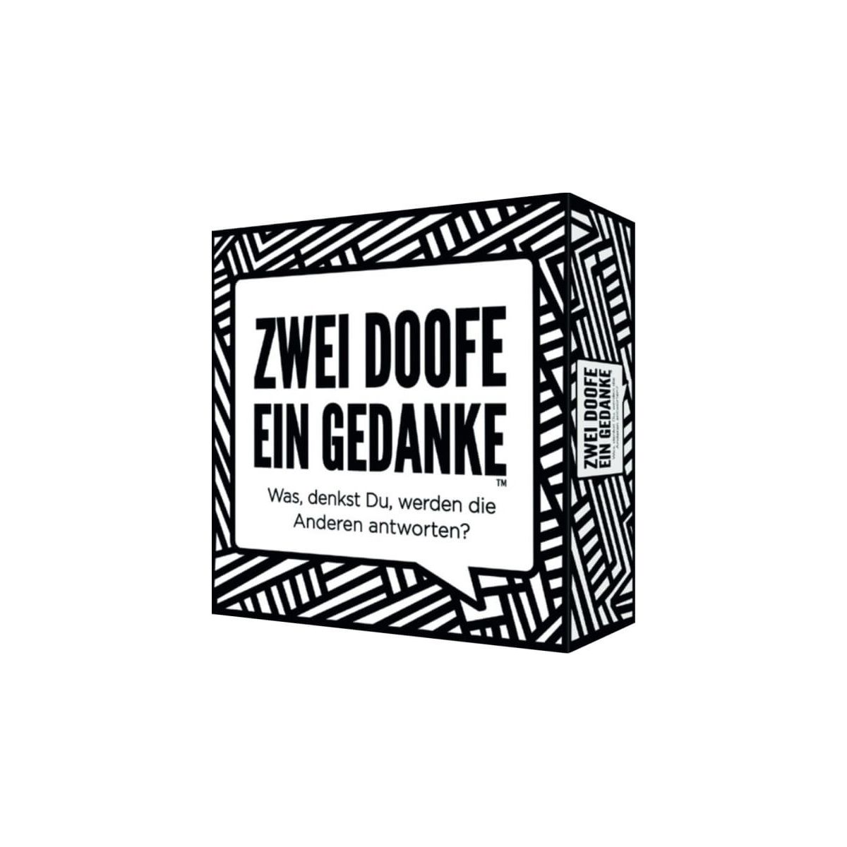 Zwei Doofe, ein Gedanke Ein TV-Moderator? Ein Körperteil? Eine Biermarke? Ein Tier im Zoo? Ein Song von ABBA? Ein Sexsymbol? Wie, denkst Du, wird die Antwort der Anderen ausfallen? Zwei Doofe, ein Gedanke ist ein mitreißendes und unterhaltsames Spiel mit hohem Funfaktor. Dabei muss jeder Spieler versuchen dieselbe Antwort abzugeben wie die anderen Spieler. Je mehr Spieler so wie Du geantwortet haben, desto mehr Punkte erhältst Du. Wie gut kannst Du Deine Mitspieler einschätzen? Der Spieler, der am Zug ist, liest die Frage laut vor und lässt jeden ein wenig darüber nachdenken und zählt dann runter 3, 2, 1... dann antworten alle gleichzeitig im Chor. Was haben die Anderen gesagt? Hat jemand genauso geantwortet wie Du? Mach Dich gefasst auf jede Menge Spaß, komplett falsche Einschätzungen und lustige Antworten! Zwei Doofe, ein Gedanke ist ein verrücktes, temporeiches und super lustiges Spiel mit mehr als 500 Themen. Ein ideales Geschenk und Mitbringsel für jede Gelegenheit, lustige Partys und gesellige Abende!.