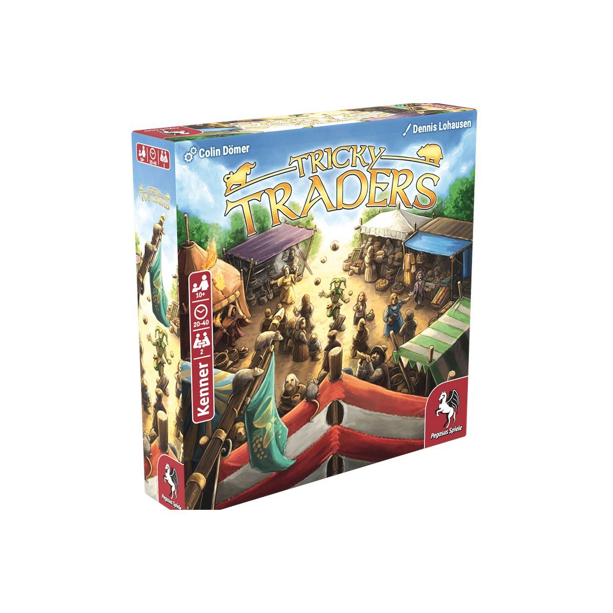 In Tricky Traders treten zwei Spielende im Duell gegeneinander an und bespielen sieben Marktstände, indem sie verschiedene Persönlichkeiten von Stand zu Stand bewegen. Über drei Tage mit jeweils drei Tagesphasen hinweg müssen sie den Markt so beeinflussen, dass ihr Marktstand floriert und die gegnerischen Marktstände in den Ruin getrieben werden. In jeder Tagesphase spielen die Kontrahent*innen zwei Einflusskarten aus, mit denen sie die Persönlichkeiten bewegen oder ihre verschiedenen Eigenschaften auslösen. Je nachdem, wo diese stehen, kann dies Ruhm oder Sabotage für die umliegende Stände bedeuten. Ebenso haben die An- bzw. Abwesenheit von Kund*innen und Ratten Einfluss auf die Wertung. Erst am Ende des Spiels offenbart sich schließlich, welche Stände die Spielenden unterstützt und welche sie sabotiert haben.