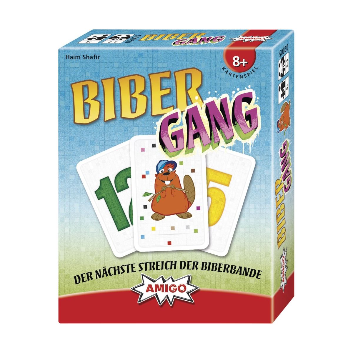 Biber-Gang MBE3 Der nächste Streich unserer frechen Biber: Tauscht bei Biber-Gang clever eure Karten, um am Ende der Runde möglichst wenig Punkte zu haben. Sammelt niedrige Punkte, oder noch besser: die gleichen Werte in einer Spalte. Riskiert ihr dabei den blinden Zahlentausch oder deckt ihr lieber erst eure Karten auf? Mit etwas Glück kommt noch ein Biber angeschwommen, der die Auslage optimiert und zum Ziel führt. ´Biber-Gang´ sorgt für kurzweiligen Spielspaß und überraschende Wendungen am Spieltisch. So spielt man Biber-Gang MBE3: * Ziel des Spieles ist es, so wenige Punkte wie möglich zu sammeln. Deshalb lohnt es sich, Karten mit kleinen Werten zu sammeln. Pärchen zählen unabhängig vom Kartenwert sogar überhaupt keine Punkte. * Jeder Spieler erhält zu Beginn der Runde acht Karten, die er in zwei Reihen zu je vier Karten verdeckt vor sich auslegt. Danach deckt jeder Spieler zwei Karten auf. Es beginnt derjenige, dessen aufgedeckte Karten die größte Summe ergeben. * Wer am Zug ist, zieht eine Karte und tauscht diese gegen eine Karte in seiner Auslage aus. Die neue Karte liegt dabei immer offen. Danach ist der nächste Spieler am Zug. * Ein ´Pärchen´ sind zwei Karten des gleichen Wertes direkt übereinander. Ein Pärchen zählt keine Punkte, mehrere Pärchen des gleichen Wertes sogar Minuspunkte. * Die Biberkarten sind Joker und helfen dabei, Pärchen zu bilden. * Die Runde endet, wenn bei einem Spieler alle Karten in der Auslage aufgedeckt sind. Alle anderen Spieler sind danach noch genau einmal am Zug. * Nach fünf Runden gewinnt der Spieler, der insgesamt die wenigsten Punkte hat. Inhalt: * 110 Spielkarten * 1 Punkteblock * 1 Spielanleitung Maße: 12,3 x 9,6 x 3,2 cm Autor: Haim Shafir Grafik: Jan Bintakies & Ran Arieli Erfolgsfaktoren: * Von Erfolgsautor Haim Shafir * Ideales Mitbring- und Reisespiel, auch für 2 Personen gut geeignet * Teil der Biber-Reihe.