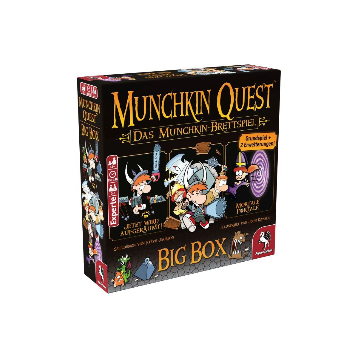 Jetzt haben Munchkin-Fans die Möglichkeit ihr Lieblingsuniversum nicht nur bretthart sondern auch komplett kennenzulernen: denn mit der neuen Munchkin Quest: Big Box erhalten sie das Basisspiel plus die beiden populären und lange vergriffenen Erweiterungen Jetzt wird aufgeräumt und Mortale Portale zusammen in einer Schachtel. Mit der gleichen Satire und bitterbösen Gemeinheit wie das Munchkin-Kartenspiel verbreitet Munchkin Quest einmal mehr Spaß und fröhlichen Wahnsinn. Töte die Monster, klau den Schatz und falle deinen Kumpeln in den Rücken – Munchkin Quest überträgt nämlich genau dieses ebenso einfache wie erfolgreiche Konzept in die Welt des Brettspiels. Gemeinsam mit der ganzen Gruppe oder auf eigene Faust erkunden die Spielenden einen Dungeon, treten Türen ein und tun das, was man in Dungeons eben tut: Monster meucheln und Schätze scheffeln! Durch den modularen Spielaufbau ist jeder Dungeon eine völlig neue Herausforderung. Munchkin, die Munchkin-Charaktere, und das Pyramiden-Logo sind eingetragene Marken oder Handelsmarken von Steve Jackson Games Incorporated in den USA und anderswo und werden von Pegasus Spiele in Lizenz benutzt. Alle Rechte vorbehalten..
