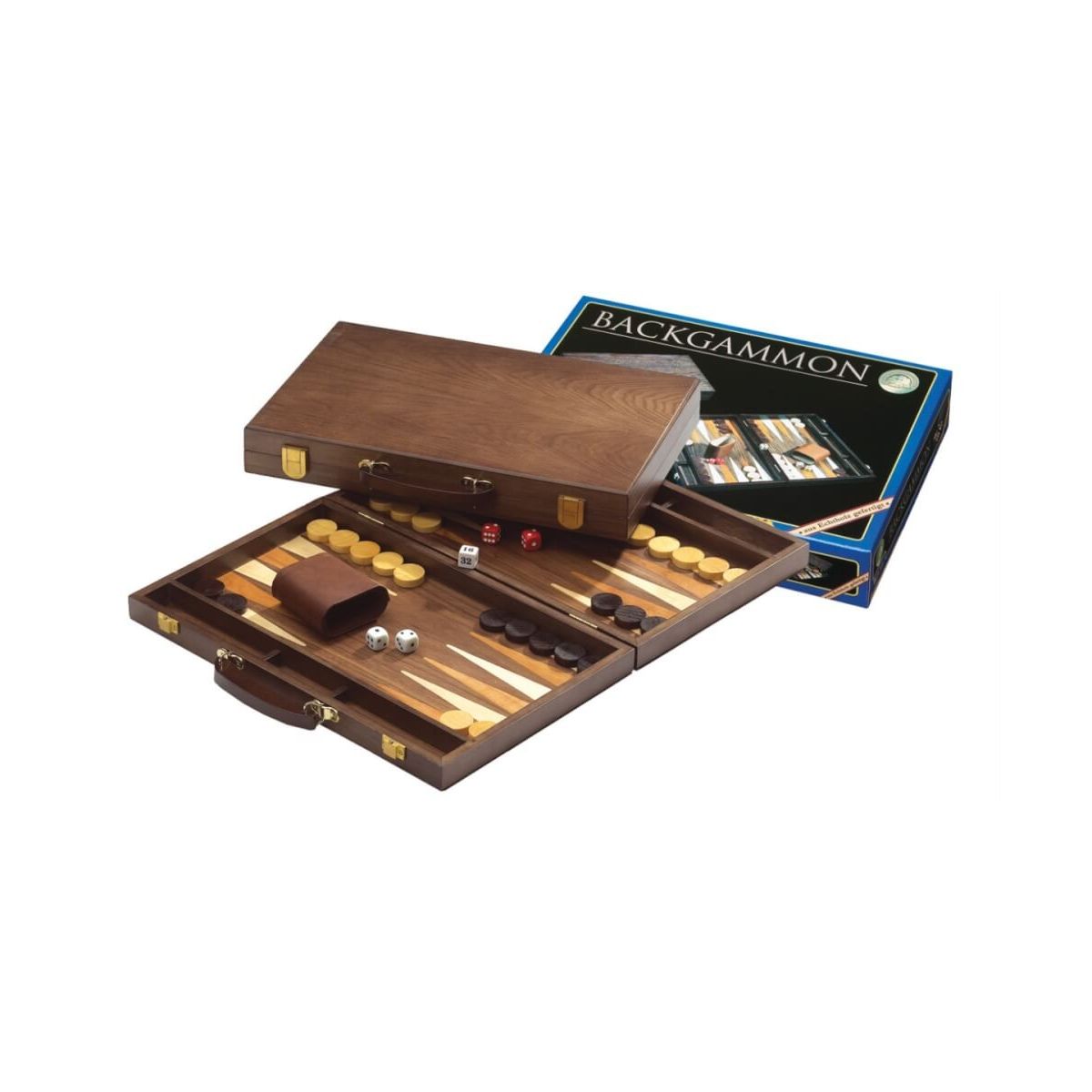 Koffer, Maße 380 x 237 x 62 mm, Eschenholz, walnuss gebeizt, Intarsien, Steinablage, mit Spielsteinen, Würfel und Würfelbecher. Backgammon ist ein spannendes Spiel für zwei Personen. Es hat einfache Regeln und Sie können sofort mit Ihrer ersten Partie beginnen. Nach einer vorgegebenen Aufstellung werden die Spielsteine auf das Spielbrett gelegt. Die Würfel bestimmen die Spielzüge. Bei jedem Spielzug bewegen Sie Ihre Spielsteine über das Brett und schließlich vom Brett. Erleben Sie spannende Momente nachdem die Würfel gefallen sind und Sie sich dann taktisch entscheiden müssen. Was wird Ihr Spielpartner würfeln? Gehen Sie auf Risiko oder sichern Sie ab? Behalten Sie die Spielzüge Ihres Gegners immer im Auge. Jeder Wurf bringt neuen Schwung und immer wieder Überraschungen ins Spiel. Auch wenn es gut für Sie aussieht, Sie können vom Spielpartner mit einem Stein rausgeworfen werden, den Sie dann wieder neu ins Spiel bringen müssen. Gewinnen wird, wer als erster seine Spielsteine vom Spielbrett abtragen kann..