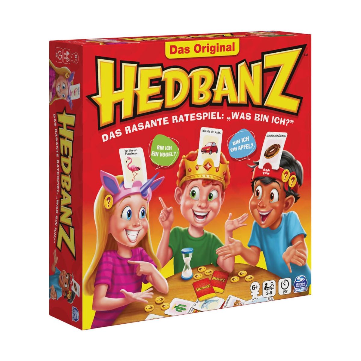 BGM Hedbanz Refresh Hedbanz - das lustige Rate- und Kommunikationsspiel für 2-6 Spieler. Die Neuauflage enthält 6 witzige individuelle Stirnbänder, einen überarbeiteten Kartensatz und vereinfache Spielregeln - für einen noch schnelleren Zugang und großen Spielspaß. Jeder Spieler trägt ein Stirnband, an dem eine Karte befestigt ist, die er selbst nicht sehen kann, sondern erraten muss. Aufgepasst, das blitzschnelle Fragenstellen geht los, denn die Sanduhr läuft: Bin ich ein Tier? Bin ich etwas zu Essen? - Wer an der Reihe ist, darf so lange unterschiedliche Fragen stellen, bis die Zeit abgelaufen ist. Hat er innerhalb der Zeit richtig geraten, darf er einen ?-Clip an seinem Stirnband befestigen und versuchen, gleich die nächste Karte zu erraten. Es gewinnt derjenige, der als erster 3 ?-Clips an seinem Stirnband stecken hat. Hedbanz, der spaßige Ratespiel-Klassiker für Kinder und Familien. Inhalt: 6 Stirnbänder 16 ?-Clips 69 Bildkarten 3 Beispiel-Fragenkarten 1 Sanduhr 1 Anleitung Maße: 26,82 x 6,68 x 26,82 cm.