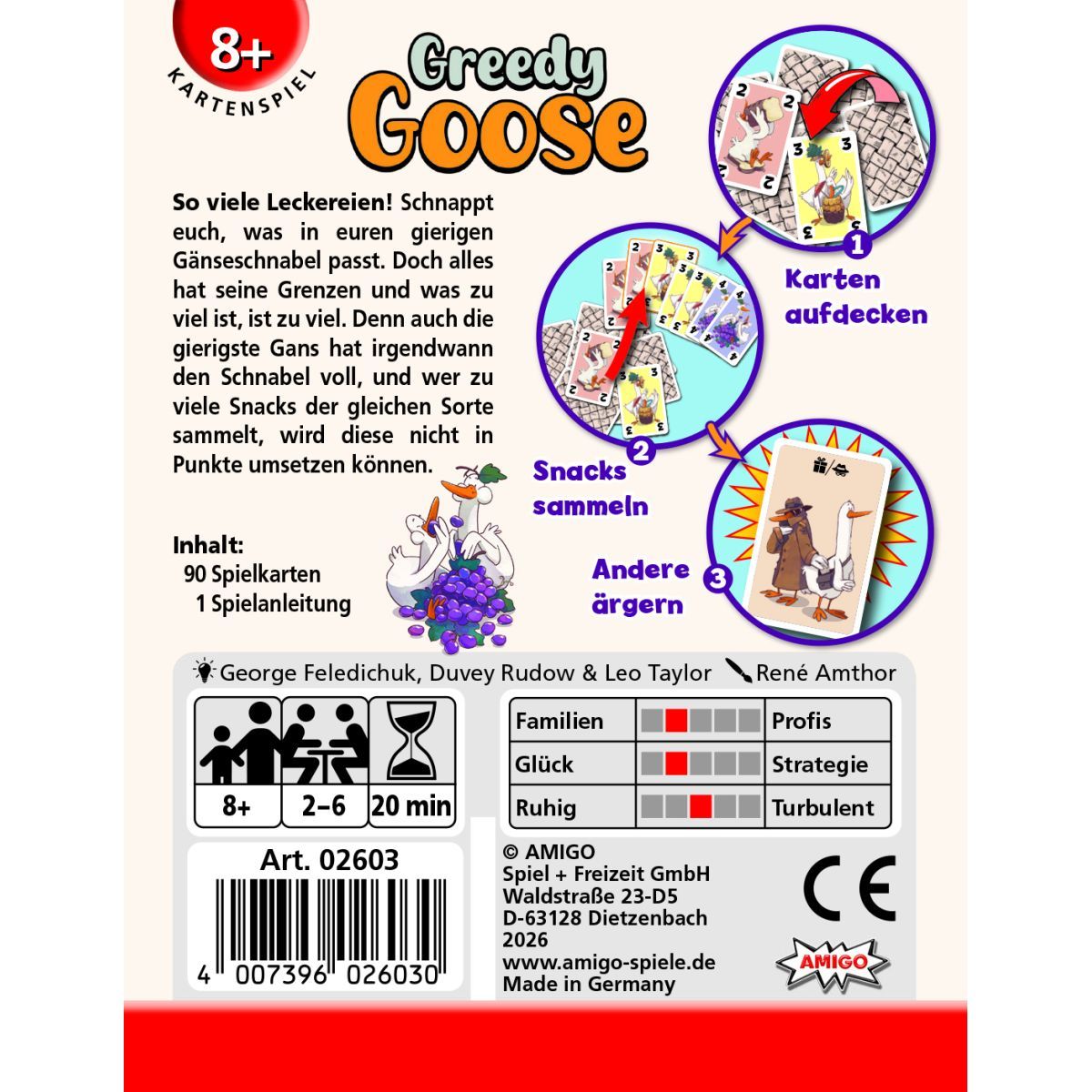Greedy Goose MBE3 So viele Leckereien! Schnappt euch, was in euren gierigen Gänseschnabel passt. Doch alles hat seine Grenzen und was zu viel ist, ist zu viel. Denn auch die gierigste Gans hat irgendwann den Schnabel voll, und wer zu viele Snacks der gleichen Sorte sammelt, wird diese nicht in Punkte umsetzen können. Ein locker-flockiges Kartenspiel mit viel Interaktion und Emotion. Da kommt Stimmung auf - egal, ob mit der Familie oder bei der nächsten Party! So spielt man Greedy Goose MBE3: * Breitet alle Karten als verdeckten Haufen in der Tischmitte aus und nehmt euch davon jeweils 3 Handkarten. * Bist du an der Reihe, deckst du so lange Karten auf, bis du aufhören möchtest. Dann darfst du alle offenliegenden Karten auf die Hand nehmen oder für die nächste Person liegen lassen. * Falls durch die zuletzt von dir aufgedeckte Karte jedoch zwei gleiche Karten zu sehen sind, musst du sofort alle offenen Karten auf die Hand nehmen. * Immer wenn du Karten auf die Hand nimmst, schaust du, ob du zu viele Karten einer Farbe auf der Hand hast. Die Zahl auf der Karte gibt an, wie viele Karten dieser Farbe du auf die Hand haben darfst. Hast du davon zu viele Karten, musst du alle Karten dieser Farbe abwerfen. * Durch Aktionskarten könnt ihr Mitspielenden Karten schenken oder klauen. * Das Spiel endet, sobald alle Karten in der Tischmitte aufgedeckt wurden. Alle Karten, die du dann noch auf der Hand hältst, bringen dir Punkte. Wer die meisten Punkte hat, gewinnt. Inhalt: * 90 Spielkarten * 1 Spielanleitung Maße: 12,4 x 9,6 x 2,1 cm Autor: George Feledichuk Grafik: René Amthor Erfolgsfaktoren: * In wenigen Sätzen erklärt * Stimmungsreiches Spielgefühl mit Ärgerfaktor * Lustige Illustrationen.