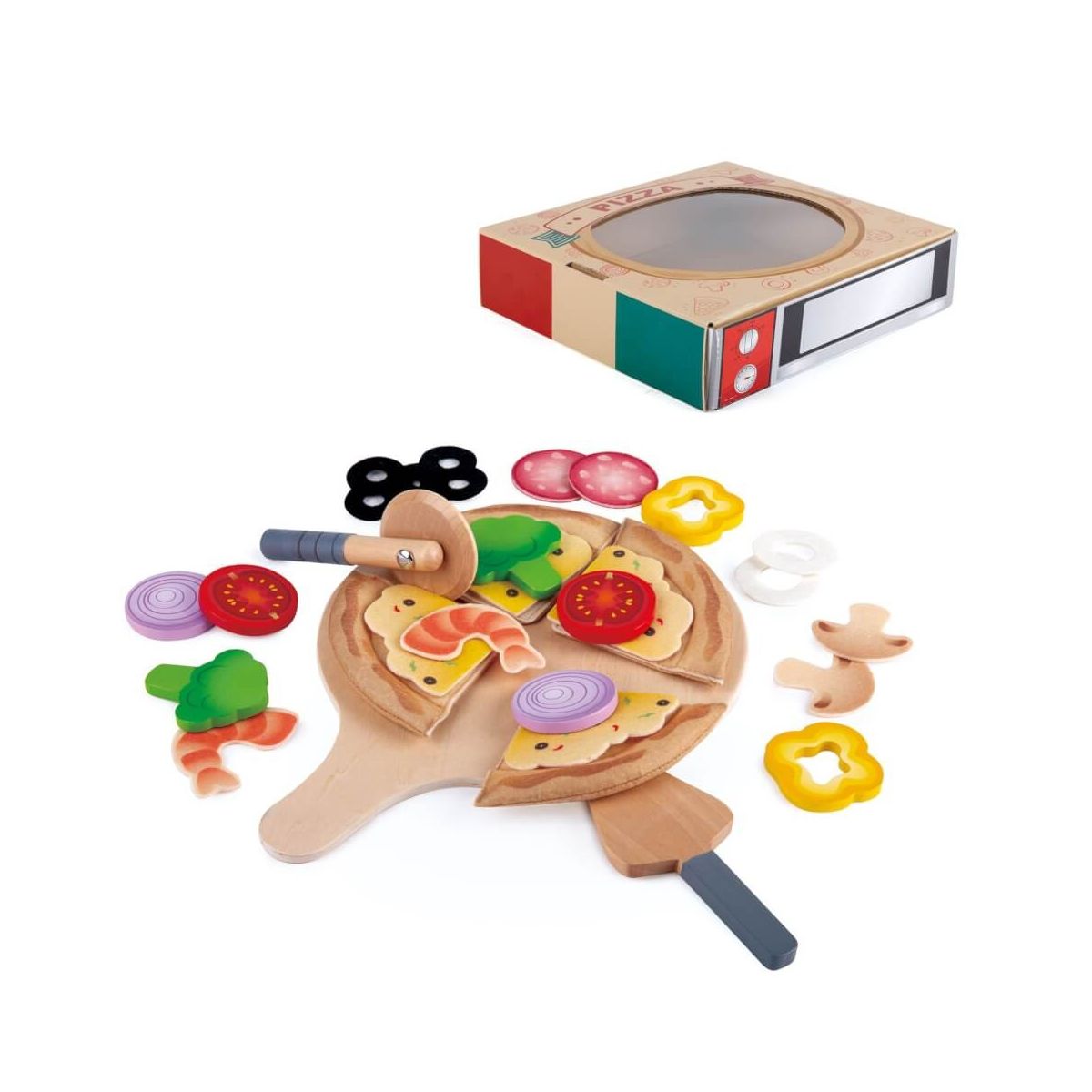Das Pizza-Set enthält einen Pizzaboden, der in Scheiben geschnitten werden kann, einen Pizzaschneider, Meeresfrüchte, Gemüse, Tomaten und sogar einen Pizzaofen, der gleichzeitig als Lieferkarton dient!.