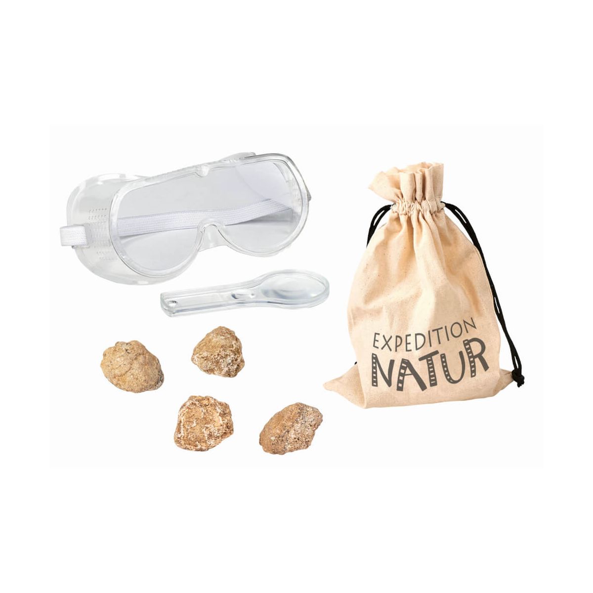Echte Schätze für wissbegierige Kinder: In den umfangreichen Ausgrabungssets der Reihe Expedition Natur können Nachwuchs-Forscher*innen echte Fossilien, Kristalle und Mineralien entdecken und dabei jede Menge lernen. Richtige Fossilien freilegen wie Paläontolog*innen, das glitzernde Innere der Geoden mit einem geschickten Hammerschlag ans Tageslicht bringen oder sich aus den selbst ausgegrabenen Mineralien einen Glücksbringer basteln – diese Sets enthalten neben den wertvollen Schätzen viele praktische Extras. Neben Schutzbrille, Werkzeug oder Aufbewahrungsbeutel liegt jedem Set ein ausführliches Booklet mit spannenden Infos und kindgerechten Erklärungen rund um Fossilien, Geoden oder Mineralien bei. Damit wird das Kinderzimmer zur Entdeckungsstation: Das große Geoden-Entdecker-Set enthält vier geschlossene Geoden, die nur darauf warten mit einem Hammer aufgebrochen zu werden. Dank der beigelegten Schutzbrille können kleine Forscher*innen die vier bis fünf Zentimeter großen Geoden sicher aufbrechen. Anschließend lassen sich die Kristalle im Inneren mit der Lupe ganz genau begutachten und entdecken. Im enthaltenen Aufbewahrungsbeutel können die Schätze schließlich verstaut werden. Junge Entdecker*innen finden im farbigen Booklet zahlreiche interessante Fakten rund um die Entstehung von Geoden und fünf Geodenarten. + 4 geschlossene Geoden, die es mit einem handelsüblichen Hammer aufzubrechen gilt (Hammer nicht im Lieferumfang enthalten) + Größe der Geoden: ca. 4 – 5 cm + inkl. Schutzbrille, Lupe, Aufbewahrungsbeutel und farbigem Booklet mit spannenden Infos zu verschiedenen Geodenarten.