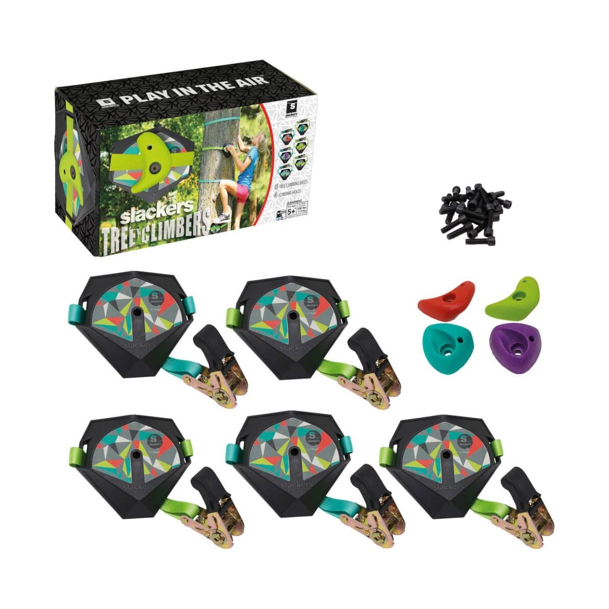 Die neuen Treeclimbers sind innovative Baum-Klettergriffe. Sie sind leicht und schnell an Bäumen mit einem Durchmesser von ca. 25-70cm anzubringen. Je nach Größe der Nutzer werden die Griffe enger oder weiter auseinander montiert. Das Set besteht aus 5 robusten Kunststoff-Platten (18x15x5cm) mit Anti-Rutsch Griptape und integriertem Gewinde an denen die Ratschengurte (220x2,5cm) fixiert sind. Die 4 verschiedenen Klettergriffe werden mit beiliegenden Inbusschrauben und Inbusschlüssel an den oberen 4 der 5 Kunststoff-Platten befestigt. Die unterste Kunststoff-Platte dient nur als Fußtritt, hier wird kein Klettergriff montiert. Die Kunststoff-Platten haben ein strukturierte, große Auflagefläche um Verletzungen am Baum zur vermeiden. Lieferung im 4c Karton. Maximale Belastbarkeit: 113kg..