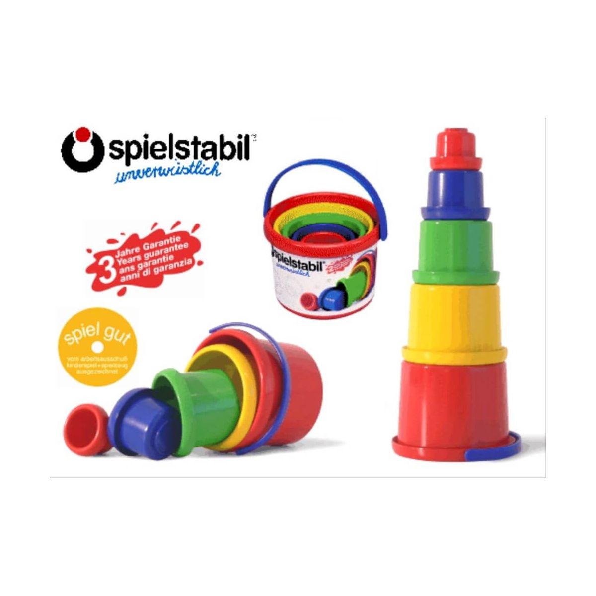 Bunte Becher für kleine Turmbauer: Die 5 Stapelbecher sind ideal zum Stapeln oder Ineinanderstecken geeignet. Sie fördern die Koordination und das räumliche Vorstellungsvermögen. Durch den weichen Kunststoff und die extra breiten Ränder lassen sich die Becher leicht stapeln. Zwei der Becher haben Löcher, so dass sie optimal zum Spielen am Strand oder in der Badewanne geeignet sind. Der große Becher hat einen Tragegriff. Dadurch lassen sich die Becher einfach verstauen und transportieren. Die gesamte Bauhöhe beträgt 34 cm und alle Setteile sind aus hochwertigem, stabilem Kunststoff gefertigt..