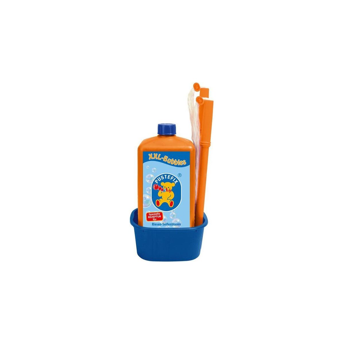 PUSTEFIX XXL-BubblesRiesenseifenblasenUnglaublich riesige Seifenblasen1000 ml FlüssigkeitAb 7 JahrenRiesen Seifenblasen für NachwuchskünstlerIm XXL-Bubbles-Set ist wie immer bei PUSTEF IX alles enthalten, um sofort große Momente erleben zu können. Die Flüssigkeit besteht aus einer spe ziellen Rezeptur, um die Spannung der XXL Bubbles möglichst lange und stabil in der Luft zu halten. Und das alles geht ganz leicht - die Flüssigkeit in den mitgelieferten blauen Behälter füllen, dann den Schnurstab vollständig in die Wanne eintauchen und dann die locker gespannte Schnur an den Stäbe n mit Schwung in die Luft ziehen, schon leuchten die Augen! Das Set beinhaltet eine Schale, Schnurst ab und 1000 ml der PUSTEFIX Flüssigkeit. So gelingt der Einstieg in die Welt der XXL-Seifenblasen ga nz easy!.