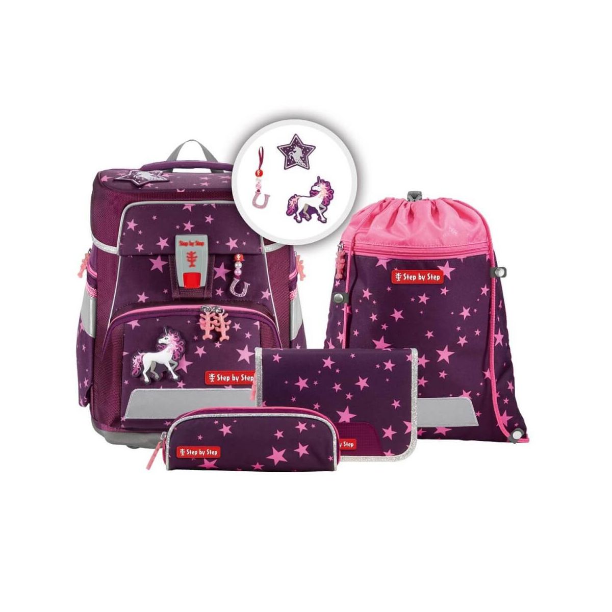 zur Beförderung von Schulutensilien vom Stift bis zum Sportzeug 5teiliges Schulranzen-Set bestehend aus: Schulranzen Federmäppchen, komplett bestückt Schlamperetui Turnbeutel MAGIC MAGS (2 Applikationen und 1 Anhänger) Schulranzen: der geräumige Schulranzen wechselbare Motive, MAGIC MAGS EASY GROW SYSTEM: Schulranzen wächst von der 1. bis zur 4. Klasse mit ultraleichte, elastische Fiberglas-Rückenkonstruktion und ergonomisch geschwungene, atmungsaktive Rückenpartie verstellbare und ergonomische Schultergurte Lageverstellriemen zur körpernahen Schulranzen-Positionierung abnehmbarer, höhenverstellbarer Brustgurt Gurtenden-Einhängung gepolsterte, abnehmbare Hüftflosse seitlich nach außen wachsende Reißverschluss und Fronttasche mit Auslaufösen Aufhängeschlaufe und gepolsterter Tragegriff Fidlock-Magnetverschluss Hauptfach mit Bücherfach Laschen zur Aufbewahrung des Federmäppchens im Deckel wasserdichte Bodenplatte reflektierende Elemente sorgen für Sicherheit im Straßenverkehr und bei Dunkelheit strapazierfähiges und wasserabweisendes Material mit 100% PFC-freier Beschichtung die Textilien bestehen zu 100% aus recycelten PET-FlaschenVerbraucherhinweis: Die Bestandteile des MAGIC MAGS-Zubehörs lassen sich beliebig oft von den entsprechenden Flächen des Schulranzens abnehmen und durch andere MAGIC MAGS ersetzen. Diese sind in 3er-Sets separat erhältlich. Für eine neutrale Gestaltung des Ranzens können die MAGIC MAGS einfach komplett weglassen werden, ohne dass störende Klettflächen entstehen. So wird jeder Schulranzen zum Unikat. Das Gewicht des Schulranzen-Korpus ohne abnehmbare Elemente beträgt ca. 1250 g..