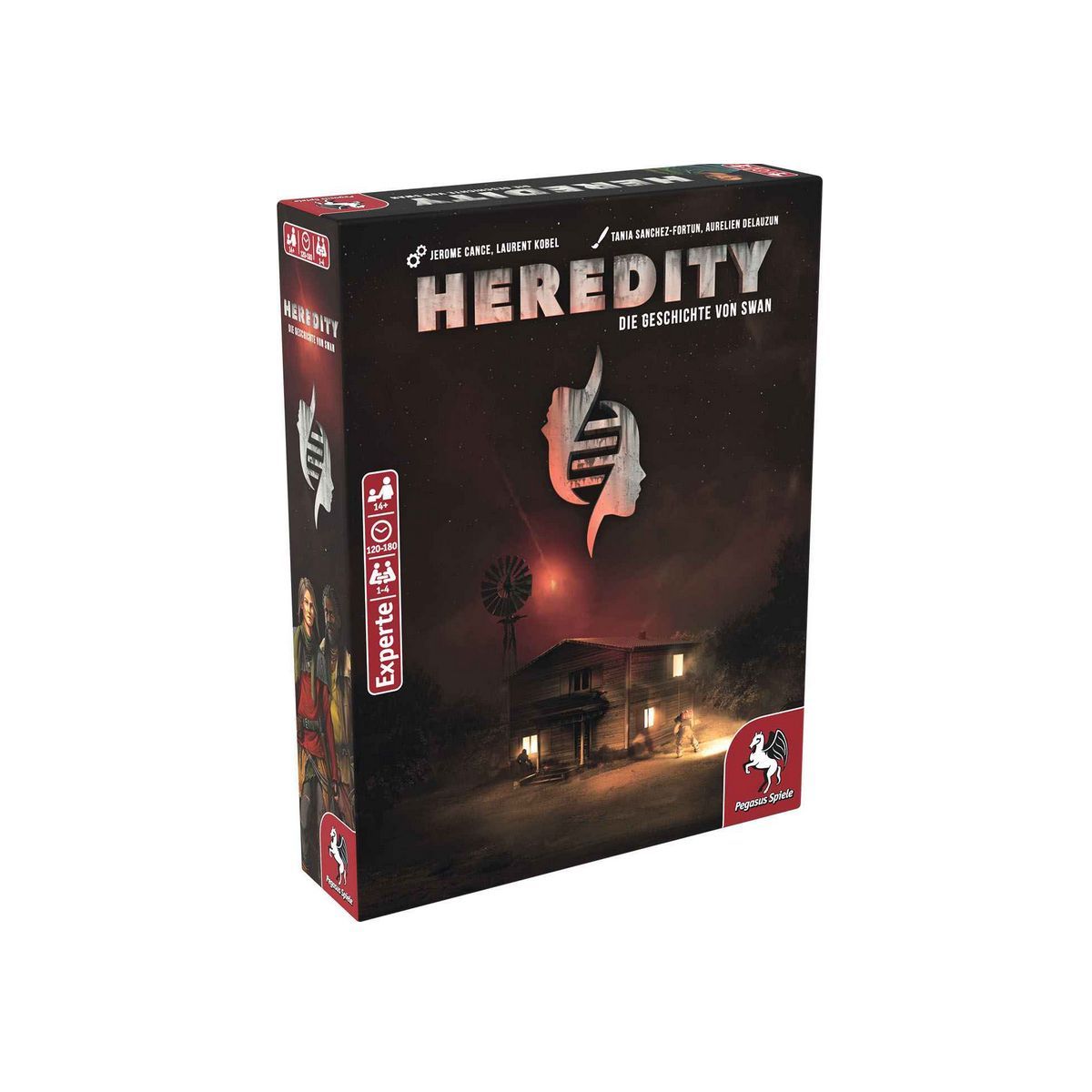 Heredity – Die Geschichte von Swan ist ein kooperatives, narratives Spiel, in dem die Spielenden in fünf Kapiteln in die Rollen der Familienmitglieder Djamal, Maeve, Selena und Brick schlüpfen, während der jüngste Bruder, Swan, in Gefahr schwebt. Mithilfe eines Zeitstrahls, der sich im Laufe des Spiels aus Erzählkarten und Begegnungen individuell entwickelt, behalten die Spielenden das Geschehen im Blick. Im Laufe der Kampagne erleben die Charaktere ein ungewöhnliches Abenteuer in postapokalyptischem Setting. Um die Kapitel erfolgreich abzuschließen, müssen sie sich mit Gegenständen ausrüsten, das Gelände erkunden und sich gegen Feind*innen zur Wehr setzen. Oder führen doch eher friedliche Verhandlungen zum Ziel? Je nach Entwicklung der Charaktere und der Geschichte, verläuft das Abenteuer immer anders und es ist Aufgabe der Spielgruppe, immer einen Blick auf ihre Handlungsfähigkeit und die anstehenden Aufgaben zu haben, ehe ein Familienmitglied so schwer verletzt wird, dass das Kapitel verloren ist.