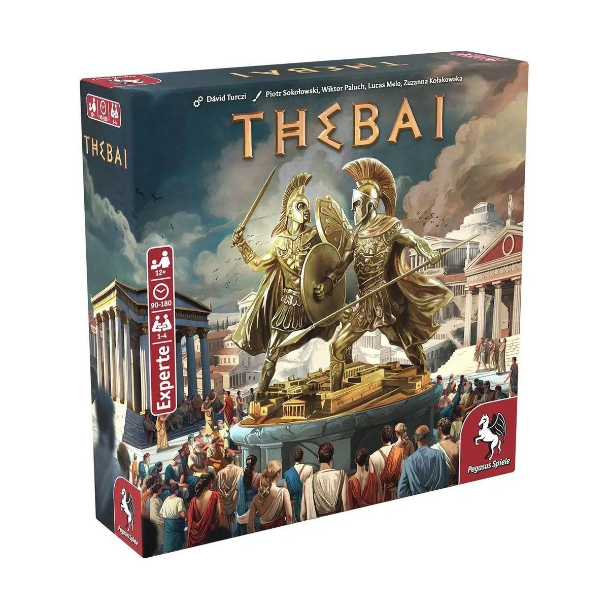 Dunkle Zeiten brechen über das Königreich Theben an. Der blinde, alte König Ödipus verließ in Ungnade den Thron und bat Polyneikes und Eteokles, seine Söhne, gemeinsam über die Stadt zu herrschen. Doch Macht korrumpiert, und uralte Fehden erfordern neues Blutvergießen. Bald führt Polyneikes eine Armee aus der rivalisierenden Stadt Argos gegen seinen eigenen Bruder. Die thebanischen Adligen unterstützen Eteokles, während er seine prekäre Herrschaft über Theben aufrechterhält. Der junge König ruft Verteidiger herbei, um die sieben Stadttore zu besetzen, während die sieben Helden der Invasoren den Angriff auf die Tore anführen. Unterdessen liegt die berühmte Zitadelle von Theben, Kadmea, in Trümmern. Es ist, als hätte das Schicksal selbst alles gegen die derzeitigen Herrscher von Theben aufgestellt! Während sich das einfache Volk auf den Krieg vorbereitet, flüstern die Adelsfamilien untereinander, dass die Zeit für eine neue Führung gekommen sei und die Zeit gekommen sei, Kadmea wieder aufzubauen! In Thebai schlüpfen die Spieler in die Rolle einflussreicher Anführer adeliger Familien während der turbulenten Spätbronzezeit. Im Laufe des Spiels müssen die Spieler Cadmea, die Zitadelle von Theben, wiederaufbauen, die Exporte der Stadt wiederherstellen, zu den Göttern der Stadt beten und das Leben der Bürger schützen, während sich vor den Toren große Helden gegenseitig ihr Blut vergießen. Das Spiel dauert 10 Runden, die jeweils in eine Aktions- und eine Schicksalsphase unterteilt sind. In der Aktionsphase verwenden die Spieler einen Bürgerwürfel und bewegen dann ihren Archonten auf Cadmea. In der Schicksalsphase erhalten die Spieler je nach ihren Leistungen und dem Schutz der Stadttore zusätzliche Punktemöglichkeiten. Nach der Schlusswertung gewinnt der Spieler mit den meisten Siegpunkten..
