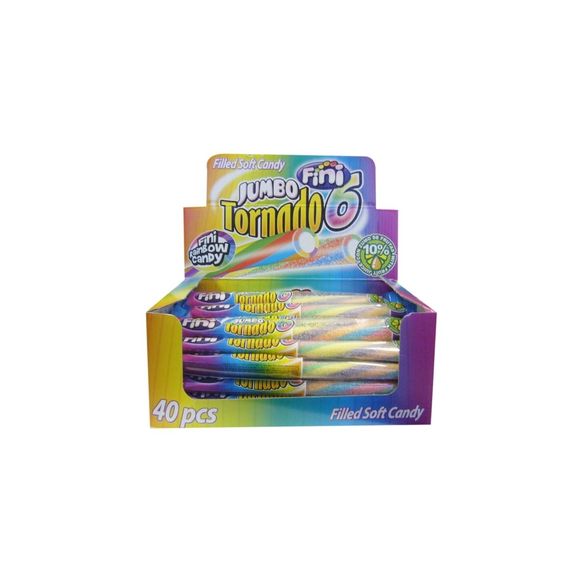 Der Geschmacks-Twister. Fini Jumbo Tornado 6 kann man drehen und wenden, wie man will: Er ist allseits einfach köstlich. Die ca. 20 cm lange Fruchtgummi-Stange verbindet unterschiedliche Aromen, die aus echten Fruchtsaft stammen. Und mit der zarten Konfektfüllung entsteht eine Spezialität, die im Mundraum für eine ordentliche Portion Aufsehen sorgt.
