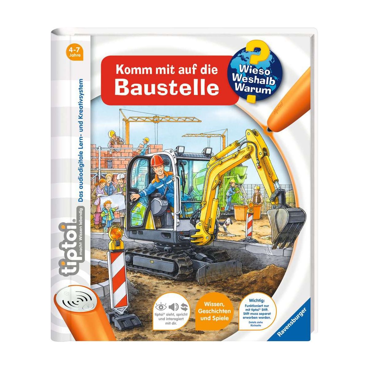 In der ganzen Stadt wird gebaut!In diesem Buch sind die Kinder hautnah dabei: Auf verschiedenen Baustellen werden die Maschinen im Einsatz gezeigt und Handwerker und Bauarbeiter erzählen Spannendes über ihre Aufgaben. Über der Autobahn wird eine neue Brücke errichtet, beim Bau eines U-Bahn-Schachtes erfahren Kinder Wissenswertes über die beeindruckende Tunnelbohrmaschine und begleiten den Bau eines Einfamilienhauses. Mit vielen Sounds, detailreichen Bildern und kniffligen Spielen für alle Baustellen- und Fahrzeugfans.Was macht der Traktor auf dem Feld? Wann kommt die Feuerwehr? Wie groß wird ein Pony? Die interaktive Sachbuchreihe tiptoi Wieso? Weshalb? Warum? beantwortet wichtige Kinderfragen auf Augenhöhe. Auf den liebevoll illustrierten Seiten tauchen die Kinder in eine Welt ein, die durch zahlreiche authentische Geräusche lebendig wird. Das Sachwissen wird altersgerecht erklärt und ist fachlich geprüft. Die Kinder können sich dank der einfachen und intuitiven Nutzung mit dem tiptoi-Stift das Wissen selbst erschließen. Sie lernen, Zusammenhänge zu begreifen und erfahren spannende Informationen über ihren Alltag und ihre Umwelt. Tolle Geschichten, Lieder und unterhaltsame Spiele laden dabei immer wieder zum selbstständigen Entdecken und Erforschen ein.tiptoi-Stift nicht enthalten. Muss separat erworben werden..