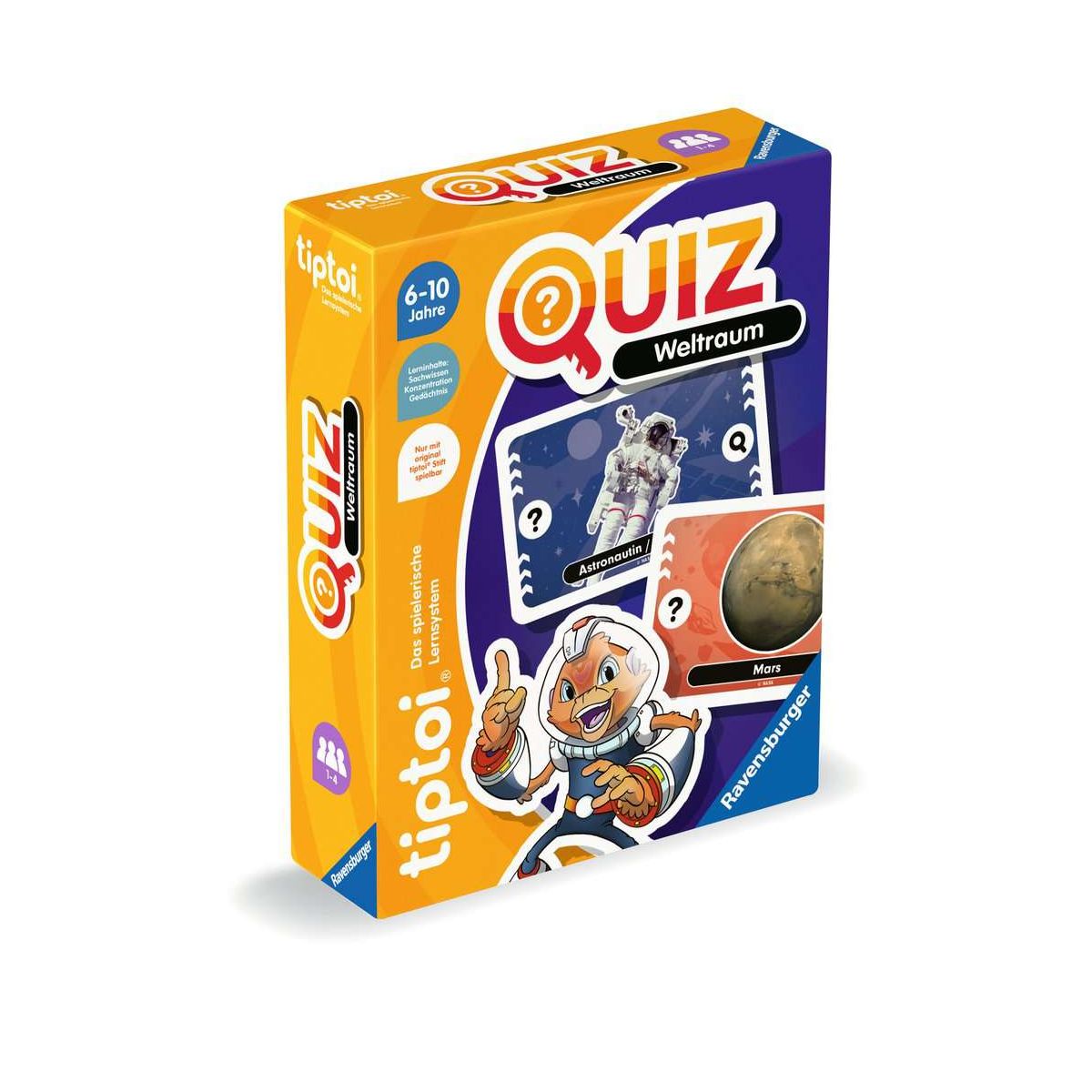 Auf der Insel Quizamui leben die lustigen Quiz-Tiere. Sie veranstalten regelmäßig ein Quiz-Turnier. Beim Quiz Weltraum nehmen die Kinder an einem dieser Turniere teil. Dabei beantworten sie Fragen rund um Sterne, Planeten und Raketen. Aber Achtung: Die frechen Quiz-Tiere stellen ganz schön kniffelige Fragen. Wer zuerst das Super-Quiz-Tier erreicht und drei besonders schwierige Fragen beantwortet, gewinnt das Spiel.Quiz Weltraum ist ein spannendes und kompetitives Quiz-Kartenspiel. Die Kinder messen sich in einem Wettlauf zum Super-Quiz-Tier. Wer eine Frage richtig beantwortet, darf auf dem Weg zum Ziel eine Karte vorrücken. Wer falsch antwortet, erhält als Ausgleich eine Joker-Karte, die in der nächsten Runde hilft, die kniffeligen Quiz-Fragen zu beantworten. Ganz nebenbei lernen sie spielerisch viele wichtige Fakten über den Weltraum.Tippen, spielen, lernen! tiptoi macht Bücher und Spiele lebendig. Tippen die Kinder mit dem Stift auf Bilder und Texte, erklingen Geräusche, Sprache und Musik. So macht Lernen richtig Spaß! Das tiptoi-Sortiment umfasst Bücher und Spiele mit den wichtigsten Lern- und Wissensthemen für Kinder ab 2 Jahren. Die zugehörigen Audiodateien lädt man einfach, sicher und schnell über den tiptoi-Manager oder die optional erhältliche Ladestation auf den Stift.tiptoi-Stift nicht enthalten. Muss separat erworben werden..