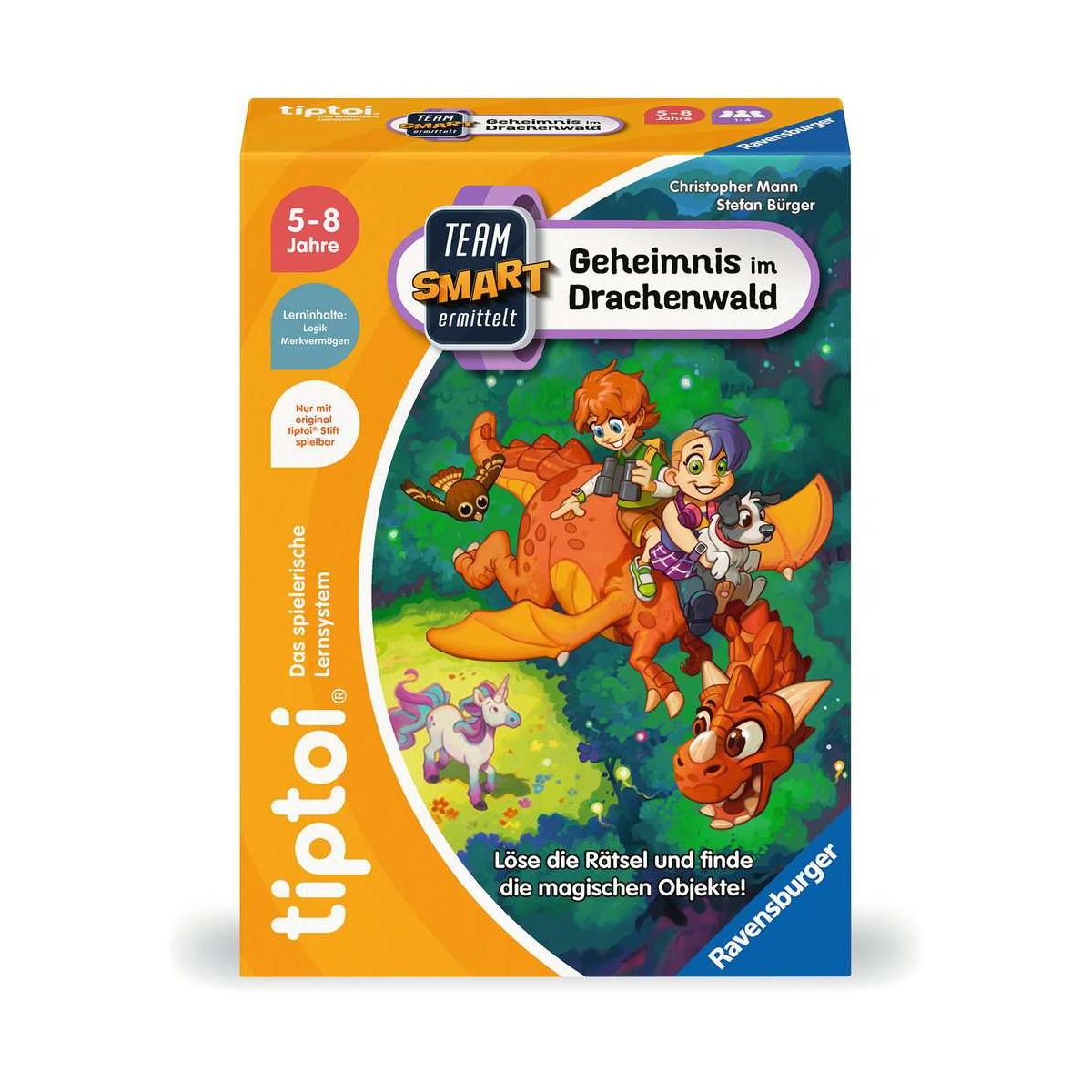 Ermittlungen im magischen Drachenwald: Team SMART löst das Rätsel um das verschwundene Drachenfeuer. Geheimnisvolle Waldwesen und Tiere stellen Aufgaben und helfen versteckte Orte zu finden. Mit jedem gemeisterten Logikrätsel kommen die Spieler und Spielerinnen der Lösung des Falls näher. Zwei weitere Abenteuer fordern das clevere Team heraus, bieten Spannung und Abwechslung. Wenn Team SMART ermittelt, ist Spannung garantiert. Team SMART, das sind Sophia, Akeem, Robin, Tessa und Hund Moxie. Mit Hilfe eines magischen Armbands gelangen sie für ihren Einsatz in fantastische Welten. Um das Team zu unterstützen lösen die Mitspielerinnen und Mitspieler gemeinsam Logikrätsel. Das bleibt auch nach mehrmaligem Spielen spannend und abwechslungsreich, denn jede Aufgabe hat mehrere Lösungswege. Alle SMART Spiele können allein oder mit bis zu vier Personen gespielt werden.Tippen, spielen, lernen! tiptoi macht Bücher und Spiele lebendig. Tippen die Kinder mit dem Stift auf Bilder und Texte, erklingen Geräusche, Sprache und Musik. So macht Lernen richtig Spaß! Das tiptoi-Sortiment umfasst Bücher und Spiele mit den wichtigsten Lern- und Wissensthemen für Kinder ab 2 Jahren. Die zugehörigen Audiodateien lädt man einfach, sicher und schnell über den tiptoi-Manager oder die optional erhältliche Ladestation auf den Stift.tiptoi-Stift nicht enthalten. Muss separat erworben werden..