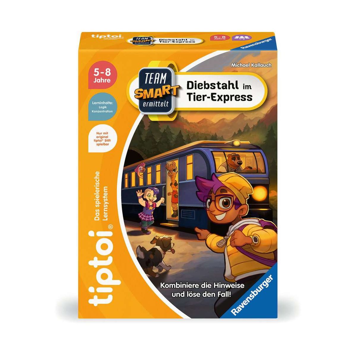 Im Tier-Express wurde ein Diebstahl begangen. Klarer Fall für Team SMART. Jetzt heißt es, die Zugabteile genau inspizieren und die Tiere befragen. Denn der Täter oder die Täterin befindet sich noch an Bord. Und jedes Tier kann es gewesen sein. Durch verschiedene Aktionen wie umsehen, fragen, zuhören, riechen erhält das Team Hinweise auf den Dieb oder die Diebin. Durch geschicktes Ermitteln und Verknüpfen der Hinweise, lässt sich der Diebstahl aufklären.Wenn Team SMART ermittelt, ist Spannung garantiert. Team SMART, das sind Sophia, Akeem, Robin, Tessa und Hund Moxie. Mit Hilfe eines magischen Armbands gelangen sie für ihren Einsatz in fantastische Welten. Um das Team zu unterstützen lösen die Mitspielerinnen und Mitspieler gemeinsam Logikrätsel. Das bleibt auch nach mehrmaligem Spielen spannend und abwechslungsreich, denn jede Aufgabe hat mehrere Lösungswege. Alle SMART Spiele können allein oder mit bis zu vier Personen gespielt werden.tiptoi-Stift nicht enthalten. Muss separat erworben werden..