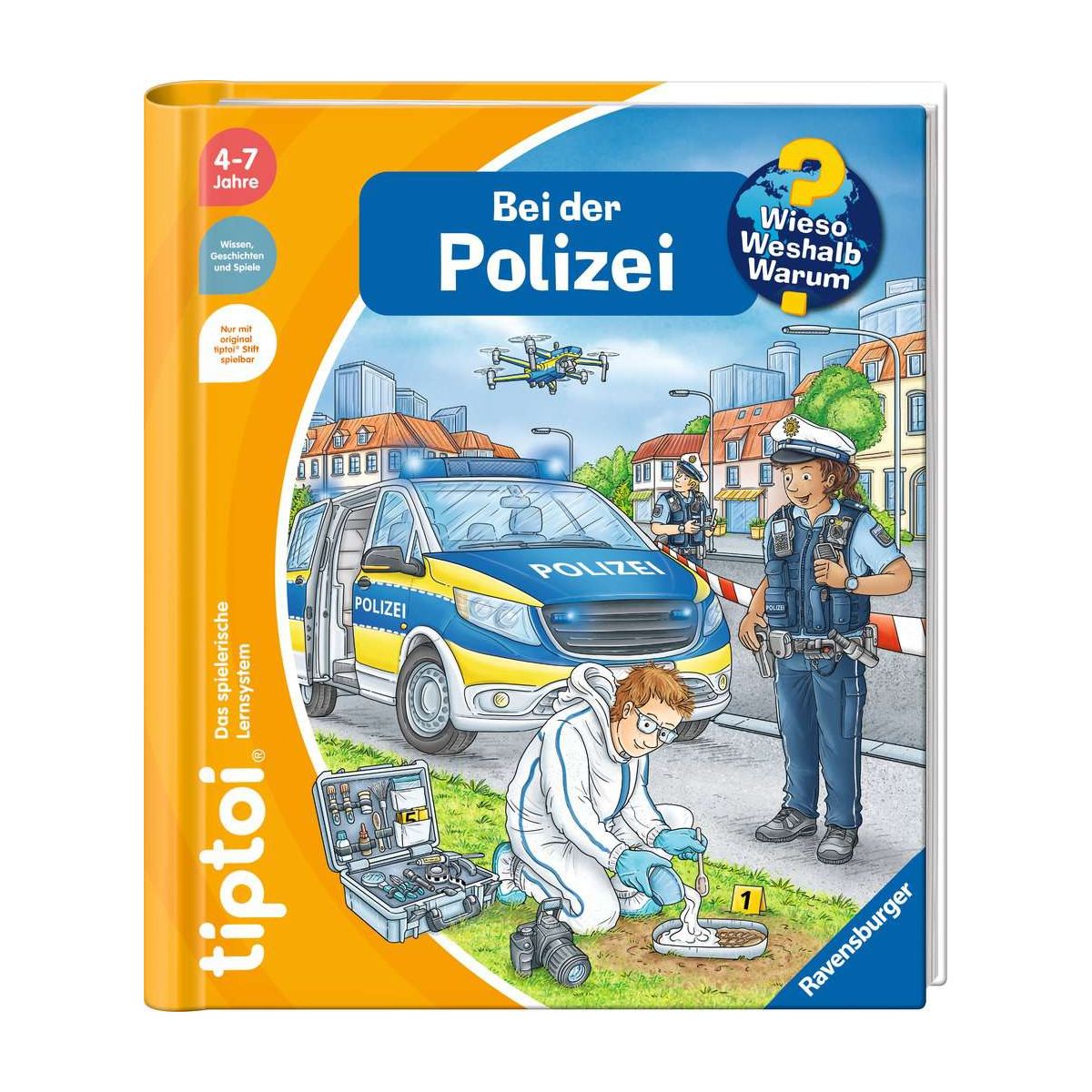 Achtung, Achtung, hier spricht die Polizei!Welche Aufgaben hat die Polizei in der Stadt? Was macht sie bei einem Verkehrsunfall oder einem Einbruch? Und wann kommt das SEK zum Einsatz? Mit tiptoi erwerben Kinder spannendes Polizei-Wissen. Sie sind mit der Spurensicherung am Tatort unterwegs und erfahren, wie im kriminaltechnischen Labor die Spuren ausgewertet werden. Auf der Polizeiwache erhalten sie Einblicke in Asservatenkammer und Arrestzelle. Zudem lernen sie verschiedene Fahrzeuge und die Ausrüstung der Polizei kennen.Was macht der Traktor auf dem Feld? Wann kommt die Feuerwehr? Wie groß wird ein Pony? Die interaktive Sachbuchreihe tiptoi Wieso? Weshalb? Warum? beantwortet wichtige Kinderfragen auf Augenhöhe. Die detailreichen Bilder werden durch zahlreiche authentische Geräusche und Erzähltexte lebendig. Das Sachwissen wird altersgerecht erklärt und ist fachlich geprüft. Dank der einfachen und intuitiven Nutzung mit dem tiptoi-Stift erschließen sich Kinder die Inhalte spielerisch selbst. Sie lernen, Zusammenhänge zu begreifen, und erfahren alles über ihren Alltag und ihre Umwelt. Zusätzlich gibt es auf jeder Seite ein spannendes Hörspiel, das die Kinder noch tiefer in das jeweilige Thema eintauchen lässt. So laden faszinierende Geschichten, Lieder und Spiele immer wieder zum selbstständigen Entdecken und Erforschen ein.tiptoi-Stift nicht enthalten. Muss separat erworben werden..