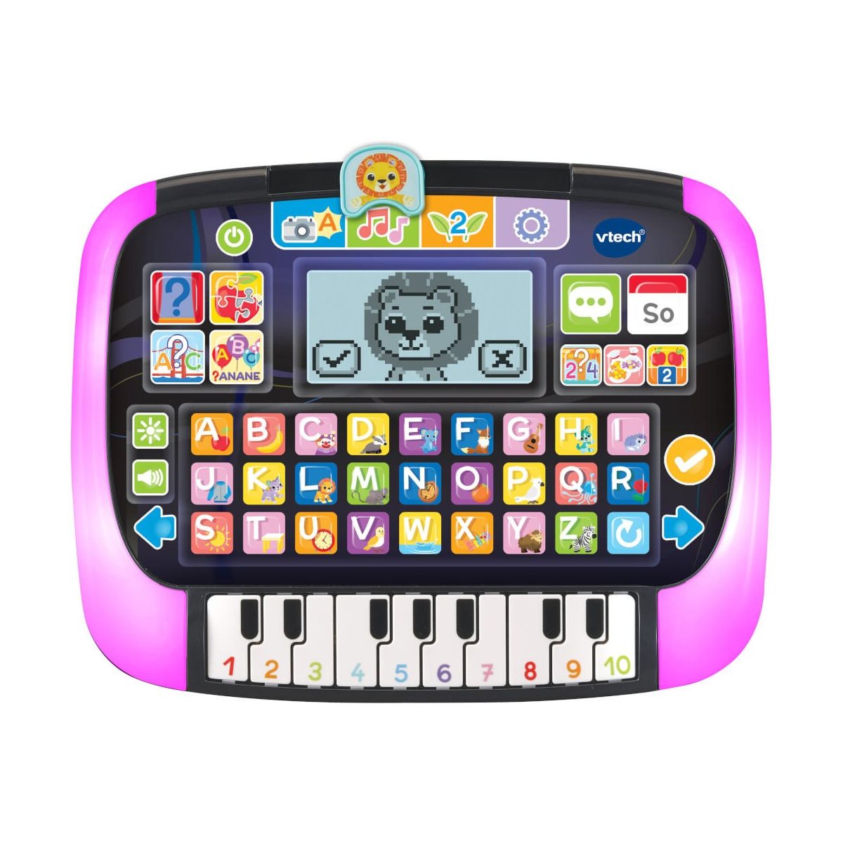 Mit dem Lern- und Musiktablet ist Lernspaß garantiert! Sprechendes, musikalisches Tablet mit leuchtendem Rahmen, Buchstaben- und Zahlentasten sowie Klavierfunktion. 26 Buchstabentasten mit passenden Bildern. 10 Klaviertasten mit bunten Zahlen. Ein niedlicher Löwe führt spielerisch durch die Aktivitäten. Hintergrundbeleuchteter LCD-Bildschirm (4 Farben) mit Helligkeitsregler. Der Rahmen des Tablets leuchtet in 4 verschiedenen Farben passend zur jeweiligen Aktivität. 12 Spielaktivitäten zu den Themen Zahlen und Zählen, Größer und Kleiner, Buchstaben, Wörter bilden, Wochentage, lustiges Fragespiel mit dem Löwen, Klavier spielen (Aktivitäten auswählbar über Schieber und Aktivitätentasten). Hintergrundmusik (insgesamt 10 Melodien) lässt sich ein- und ausschalten. Kindersicheres Batteriefach, Abschaltautomatik und Lautstärkeregler. Demobatterien sind enthalten. Ab 24 Monaten..