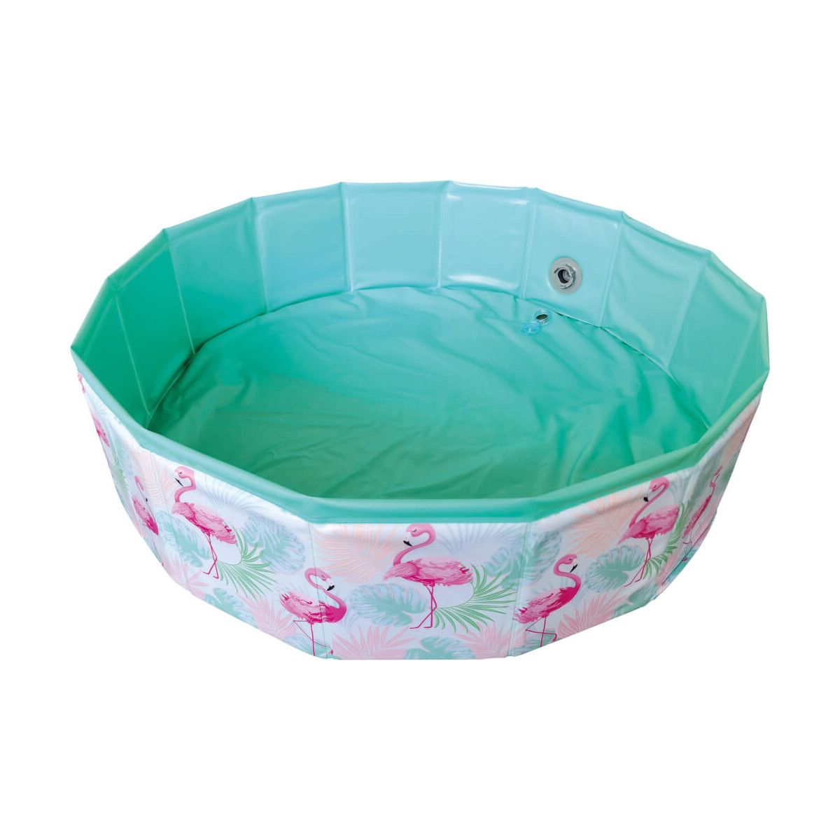 Splash und Fun Fix Pool im Flamingo Design, faltbar und mit Tasche. Praktisch für unterwegs. Der Pool hat einen Durchmesser von ca. 80 cm. Füllinhalt ca. 75 Liter. Maximale Belastung ca. 25 kg. Aus strapazierfähigem PVC mit einer Materialstärke von 0,25mm. Maße ca. 80x20 cm. Für Kinder ab 12 Monaten.