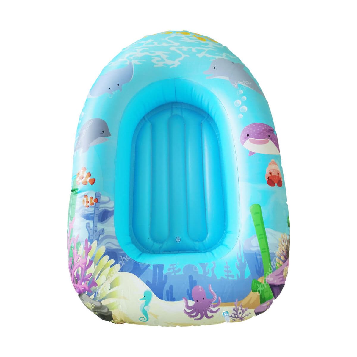 Splash und Fun Kinderboot Ocean. Aus langlebigem PVC. Materialdicke ca. 0,20 mm. Maße aufgeblasen ca. 100x68 cm Maße nicht aufgeblasen ca. 108x80 cm. Maximales Nutzergewicht ca. 40 kg. Für Kinder ab 3 Jahren.