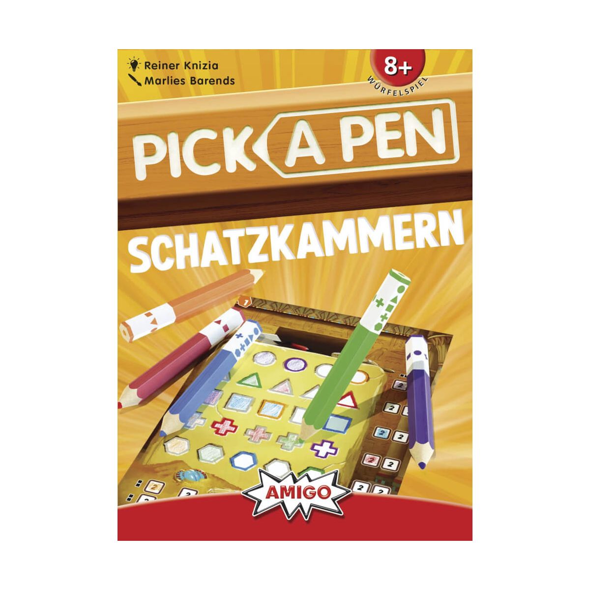 Pick a Pen: Schatzkammern In ''Pick a Pen: Schatzkammern'' versuchen die Spielenden, antike Inschriften möglichst erfolgreich zu entziffern. Die gewürfelten Buntstifte geben dabei vor, mit welcher Farbe welches Symbol ausgemalt werden darf. Dabei versuchen alle, möglichst viele Reihen und Spalten zu vervollständigen, um so raffinierte Kettenzüge zu erzeugen. Wer am Ende die meisten Punkte hat, gewinnt. Das neue ''Roll & Write''-Spiel mit drei verschiedenen Leveln für langen Spielspaß! So spielt man Pick a Pen: Schatzkammern: * Entscheidet gemeinsam, welches der 3 Level ihr spielen möchtet und teilt euch jeweils den entsprechenden Spielbogen dazu aus. * Bist du am Zug, nimmst du die 5 Stifte und würfelst sie in die Tischmitte. Nimm dir dann als Erstes einen Stift aus der Tischmitte. Danach ist die im Uhrzeigersinn nächste Person an der Reihe, sich einen Stift auszusuchen. * Male in deiner ausgewählten Farbe auf deinem Bogen das Symbol aus, welches auf deinem Stift abgebildet ist. * Versuche, durch cleveres Ausmalen in jeder Reihe und jeder Spalte Bonusziele zu erreichen und mit Farbgruppen zu punkten. Malst du farbig umrandete Symbole in der entsprechenden Farbe aus, darfst du sogar einen Bonuszug machen! * Sobald eine Person alle Symbole ausgemalt hat, endet das Spiel. Wer dann die meisten Punkte hat, gewinnt! Inhalt: * 5 Buntstifte * 1 Block * 1 Spielanleitung Maße: 17 x 12,7 x 3,7 cm Autor: Reiner Knizia Grafik: Marlies Barends Erfolgsfaktoren: * Innovatives ''Roll & Write''-Spiel, bei dem Stifte als Würfel dienen * Teil der neuen Produkt-Reihe von Erfolgsautor Reiner Knizia * Drei verschiedene Level sorgen für langen Spielspaß.