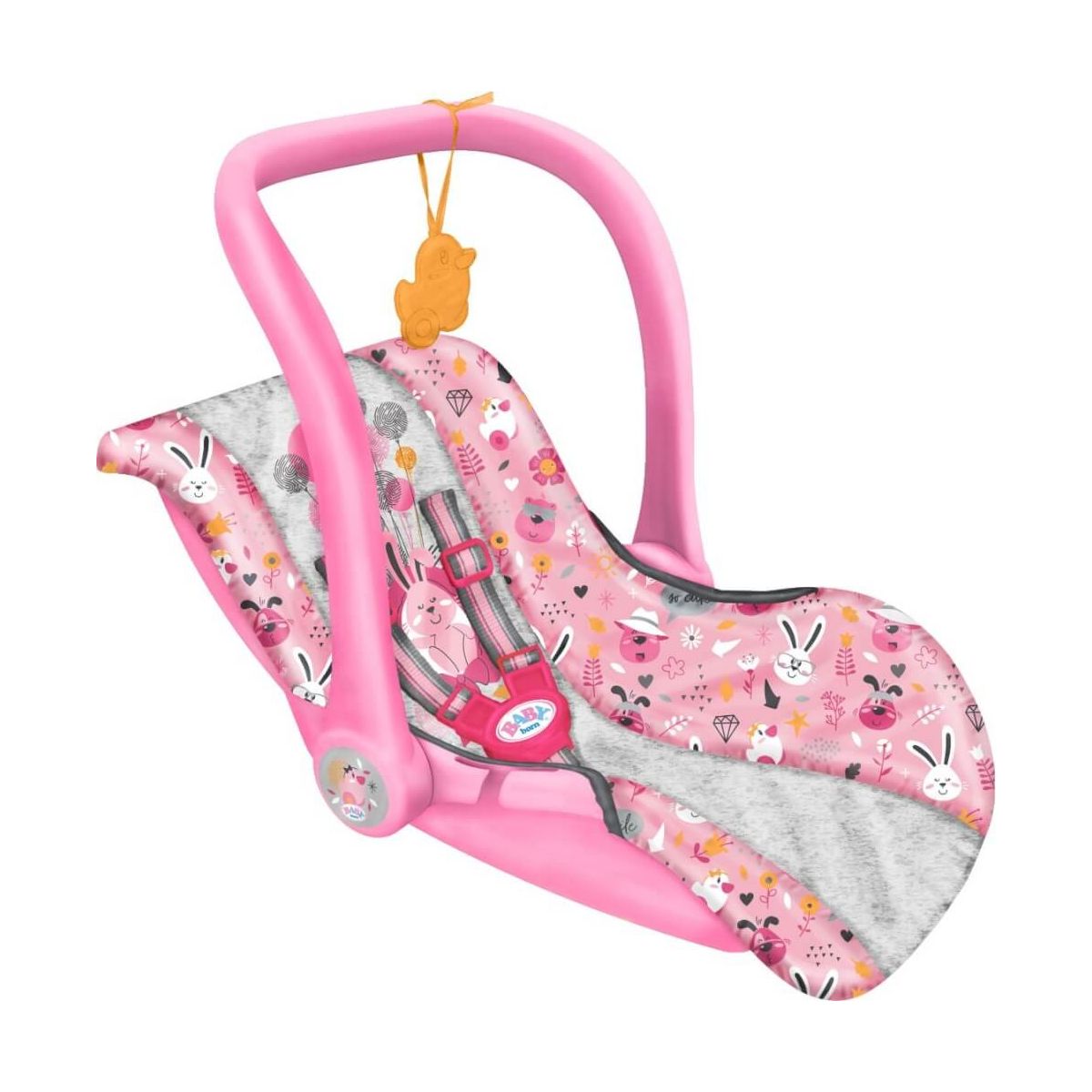 ''In BABY borns liebevoll designter Komfortzone wird sitzen bleiben zur neuen Lieblingsbeschäftigung. Einfach den Griff der Babyschale umklappen und schon wird der perfekte Sitz daraus. So kann die kleine Weltentdeckerin gut die Umgebung beobachten. Das Gurtsystem hält sie sicher im Sitz, während sie sich nach links und rechts dreht und nach hier und da deutet. Manchmal gibt es aber auch einfach nichts zu sehen. Dann kann die Kleine in Rückenlage entspannt schlummern oder mit dem Ente-Berta-Anhänger spielen. Während BABY born größten Liegekomfort genießt, können Mama und Papa das extra leichte Teil bequem durch die Gegend tragen. Wenn es BABY born zu langweilig ist, kann die Schale auch als Wippe benutzt werden. Schaukeln entspannt ja bekanntlich und sorgt für ein frohes Gemüt| genauso wie der verspielte Stoffüberzug. •.